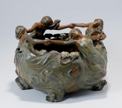 Négy domború levélmintás lábon álló lapított félgömb forma gazdag floreális díszítéssel. Peremén virágmotívumok közt négy táncoló nő alakja, lobogó drapériájú ruhában, összefont kézzel.