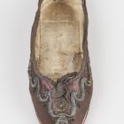 | Anyag: | arany színű fémflitter; aranyszínű bouillon; aranyszínű fémfonal; bőr; bőr talp; selyem |