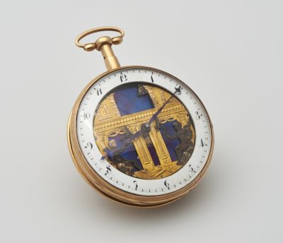 Kettős fedelű, tagozott peremmel, áttört sárgaréz rugóvédővel, ütőszerkezettel, fehér zománcos számkoronggal, fekete arab számokkal. A számlap közepén aranylapokból készült oszlopos architektúrában felül szakállas figura kalapáccsal harangot üt, alul két ülő amorett szintén harangot üt. Az óraszerkezet hátlapján „Berthoud á Paris" vésett felirat, belső fedőlapján „H. Meumier (sic!) á Paris No 11968" felirat. Függesztője ovális. Az előbbi szignatúra feloldásához ld.: Baillie, G. H.: Watchmakers and clockmakers of the world. 3. ed. London, 1951, 25. p.