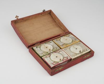 A négy különböző színű – piros, fehér zöld, és sárga – dobozka kialakítása egyforma, chinoiserie díszítése egymáshoz hasonló. A lapos, négyszögletes dobozok alja és fedele keskeny peremmel túlnyúlik az oldallapokon. Felhajtható fedelük réz csuklópánton fordul. A dobozok figurális és ornamentális díszítményé minden oldalon keskeny keretben jelenik meg. Fedelükön középén delfint ábrázoló kerek tárcsa helyezkedik el, a tárcsa elfordításakor a rajta levő szív alakú nyílásban számok tűnnek elő I–X-ig